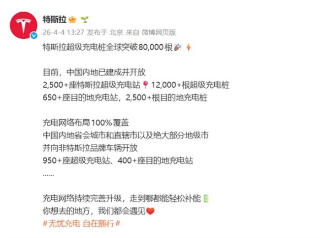 值得关注的是,2026年3月28日,特斯拉在重庆高速公路服务区一次性建成55座超级充电站,并正式向非特斯拉品牌车辆开放使用。截止目前,特斯拉已向非特斯拉品牌车辆开放950余座超级充电站和400余座目的地充电站。共计1350余座充电站。