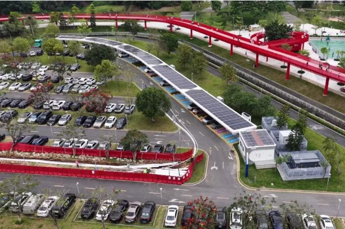 此外,虹桥公园超充站车棚铺设了约600平方米的光伏板,与公园红色栈道呼应,年发电量约14万度,可实现全时段智能运维与安全告警。