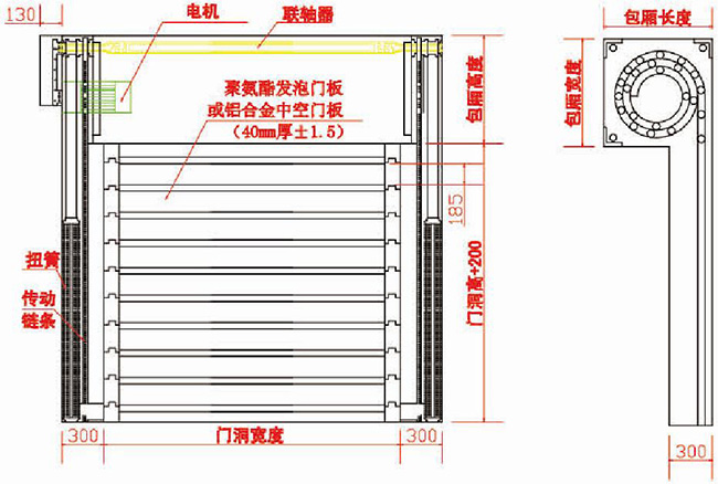 硬质快卷门主要由轨道、门板部件、扭簧、传动链条、电机、控制系统等组成。