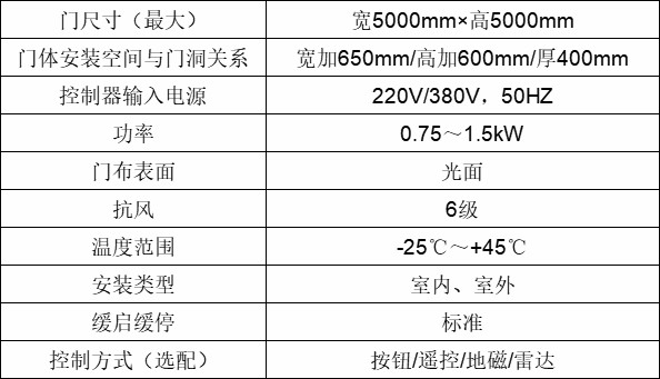 3、电控系统——运用变频控制技术,有软启动,缓停止功能,保证门体运转平稳增加使用寿命。控制箱体带按钮可手动启动。