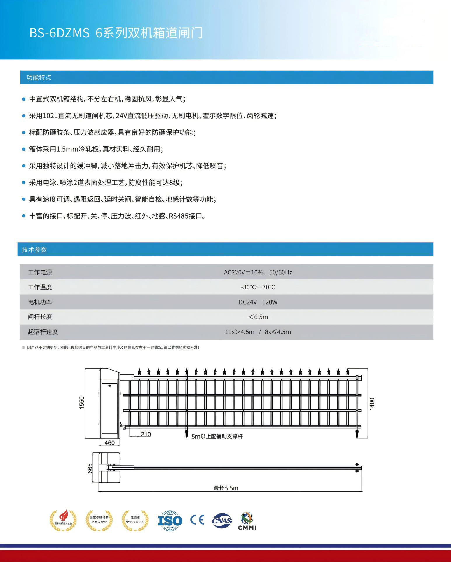 ● 采用102L直流无刷道闸机芯,24V直流低压驱动、无刷电机、霍尔数字限位、齿轮减速;